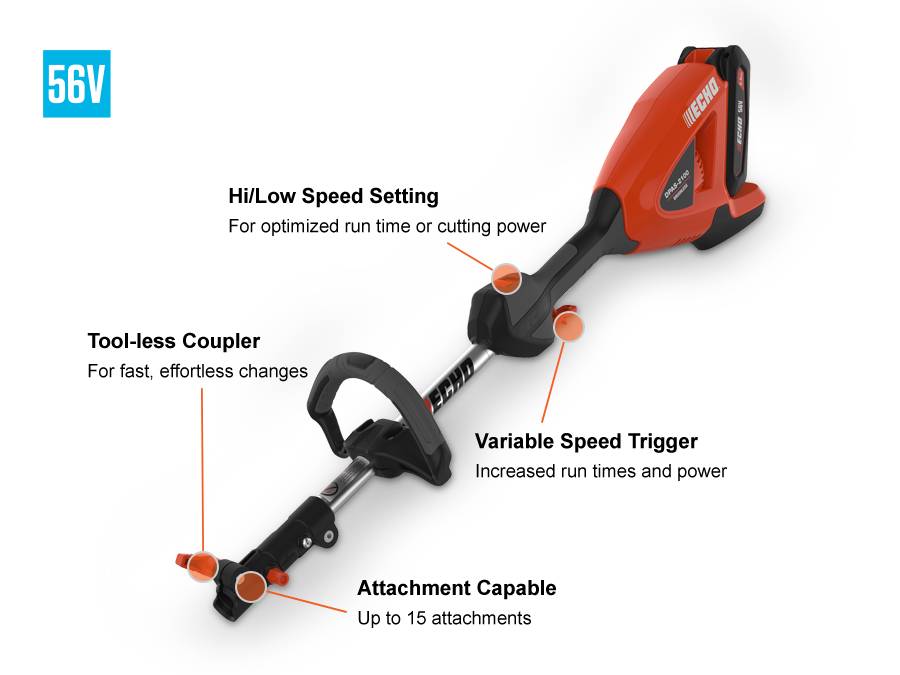 The ECHO Battery System 56V DPAS-2100C1 is the perfect all-in-one solution for homeowners. Being able to utilize one power head with 15 different attachments adds versatility while keeping the overall need for dedicated tools low. Now available as stand-alone powerhead with 2.5Ah battery and standard charger.