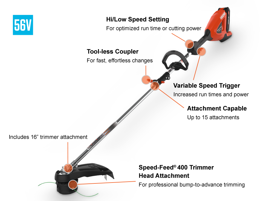 | Attachments | Curved Shaft Edger Straight Shaft Edger Hedge Trimmer Blower Cultivator Power Pruner® Speed-Feed® 400 Trimmer Pro-Torque Trimmer Pro Sweep™ Articulating Hedge Trimmer Brushcutter Curved Shaft Trimmer Pro Paddle™ 3' Extension Mid-Reach Hedge Trimmer |